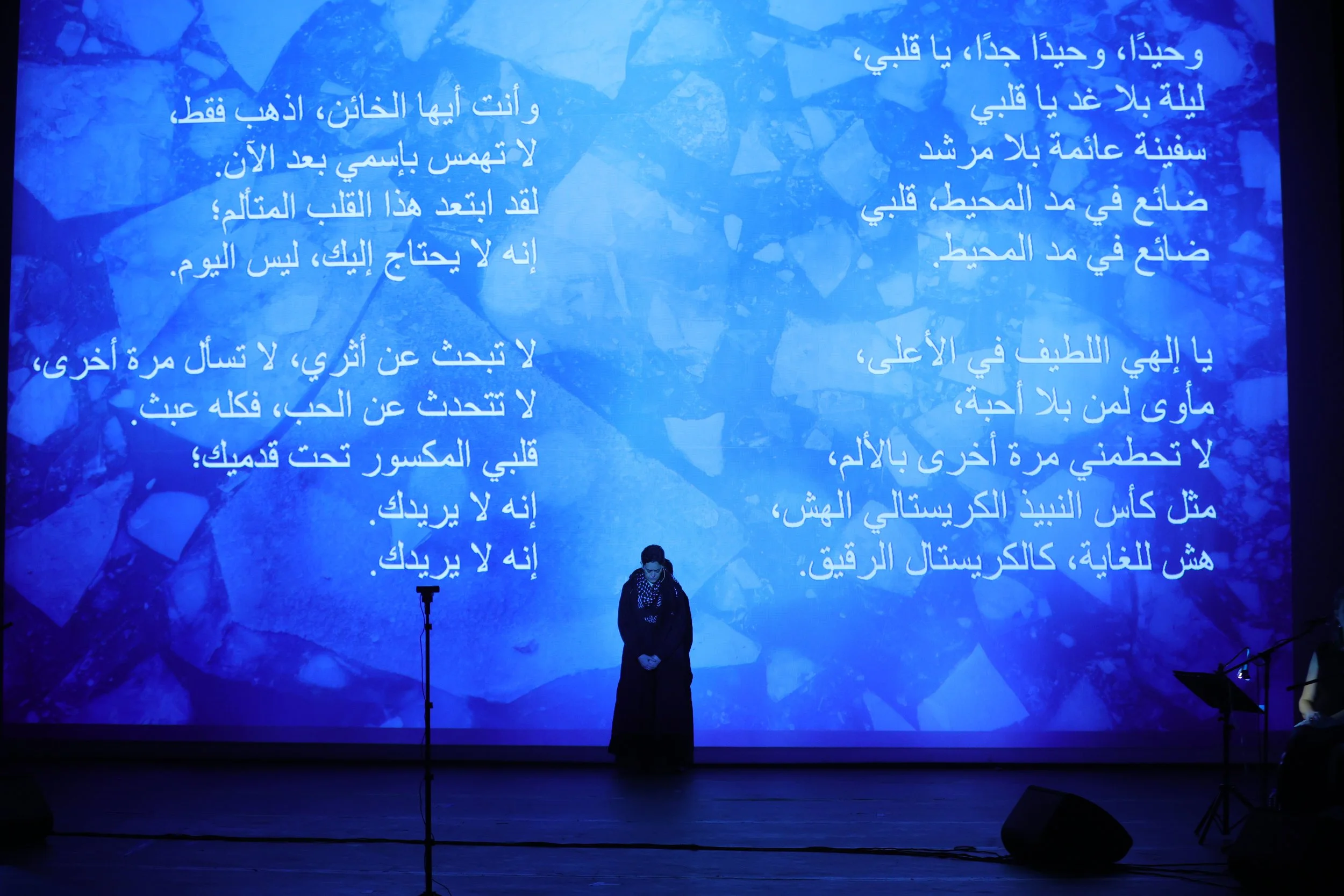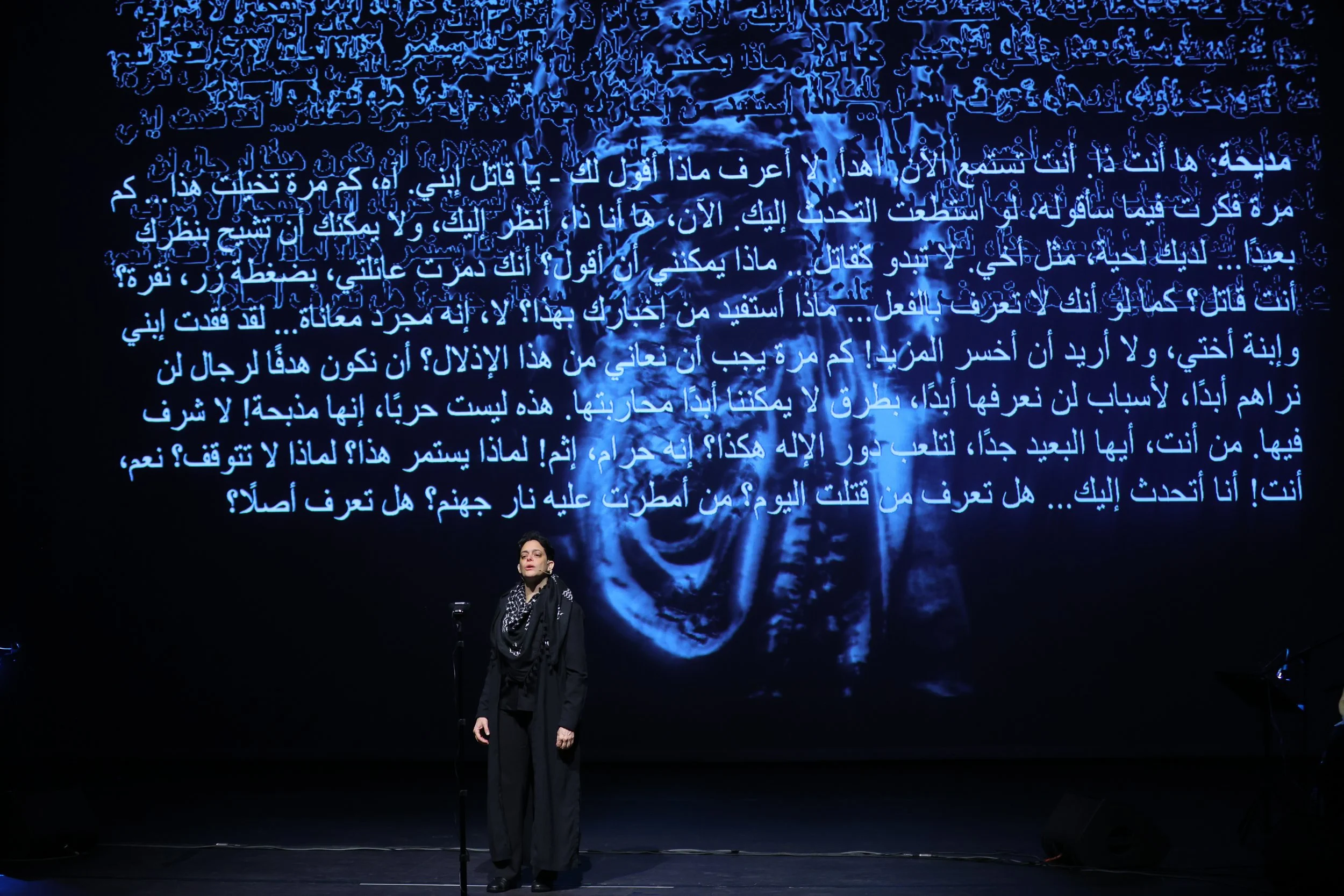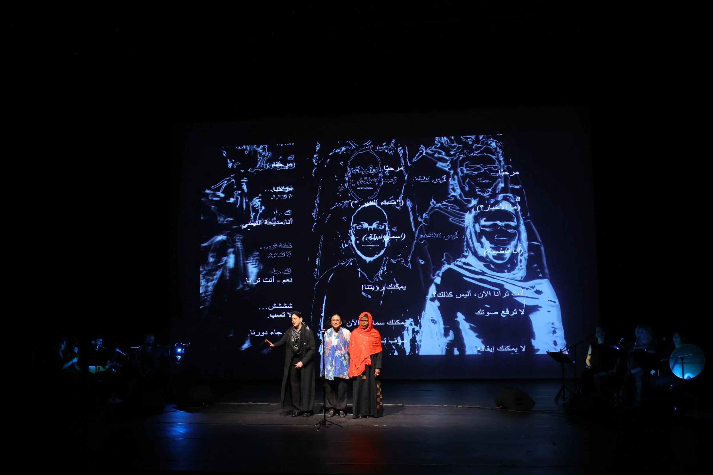 Photos below are from DRONE: Testimonies & Music performed at the Downtown Contemporary Arts Festival (D-CAF) October 22-23, 2025, at the Falaki Theatre. Featuring: Andrea Assaf, Dalia Basiouny, Ashley Wilkerson, Eylem Basaldi, Lubana Al Quntar, Kathy Randels, Aida Shahghasemi, Bishoy Youssef and Bassem Diaa, with media design by Eva Auster. Photos by Yasser Hemaya.