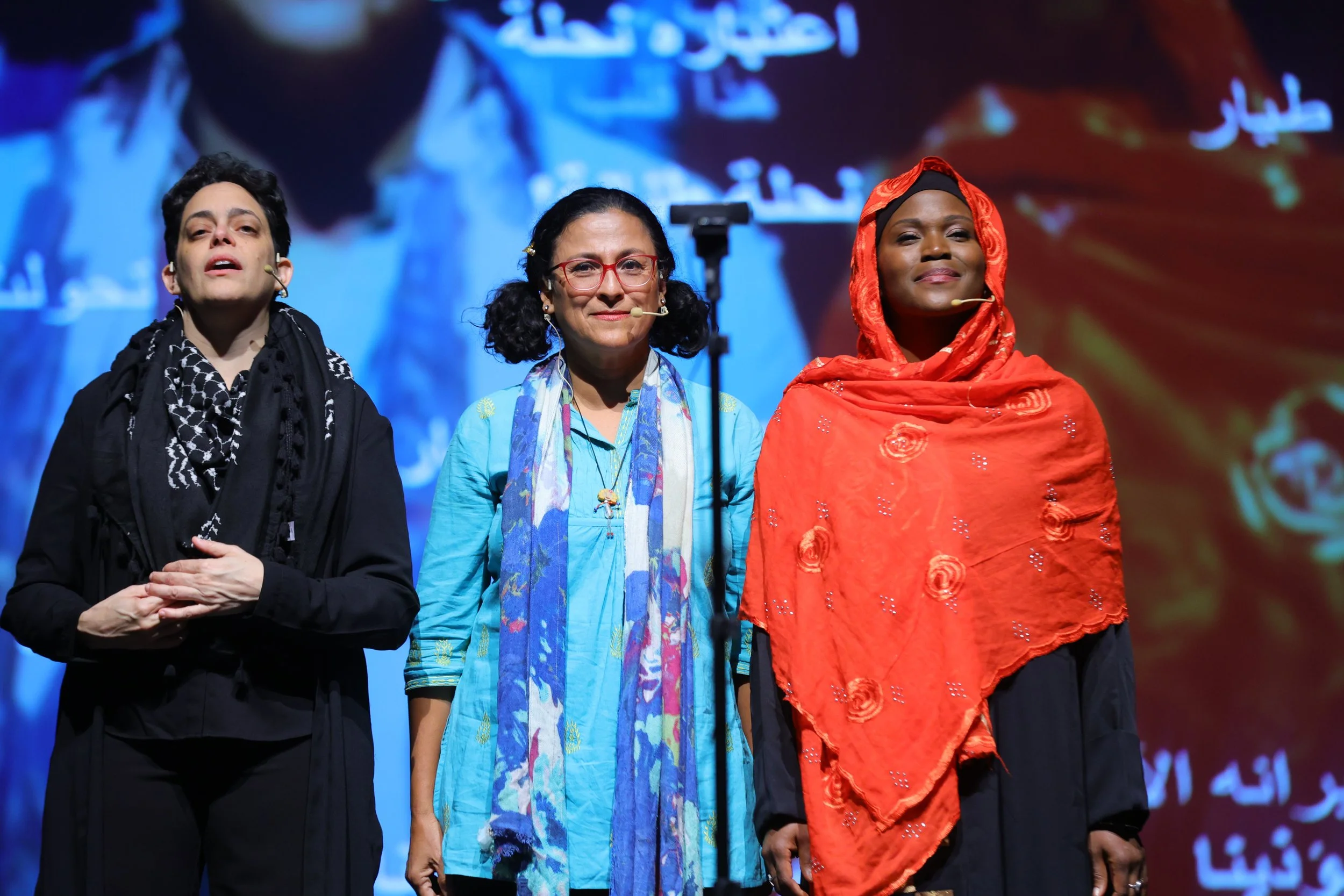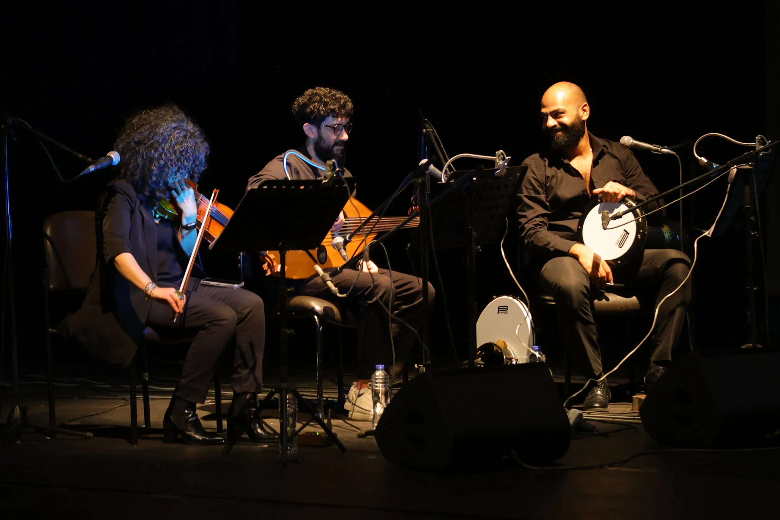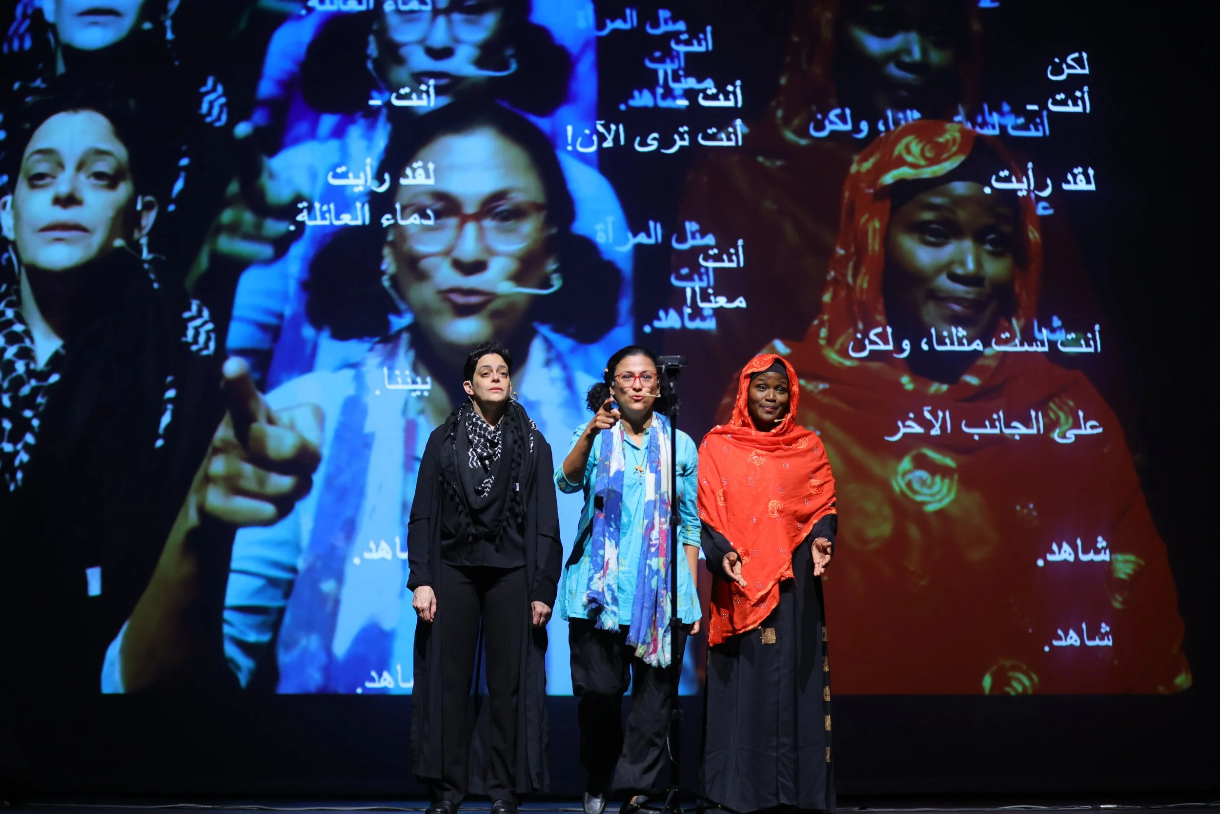 Photos below are from DRONE: Testimonies & Music performed at the Downtown Contemporary Arts Festival (D-CAF) October 22-23, 2025, at the Falaki Theatre. Featuring: Andrea Assaf, Dalia Basiouny, Ashley Wilkerson, Eylem Basaldi, Lubana Al Quntar, Kathy Randels, Aida Shahghasemi, Bishoy Youssef and Bassem Diaa, with media design by Eva Auster. Photos by Yasser Hemaya.