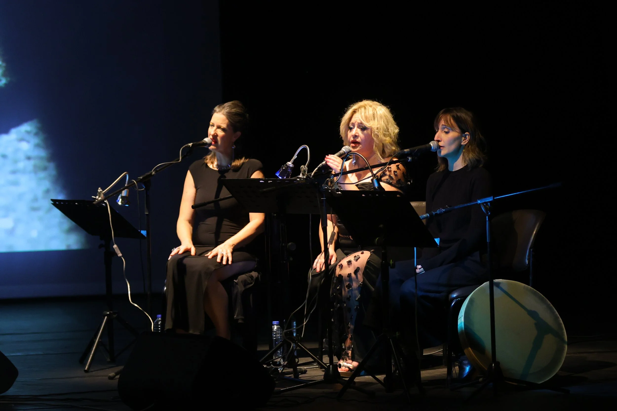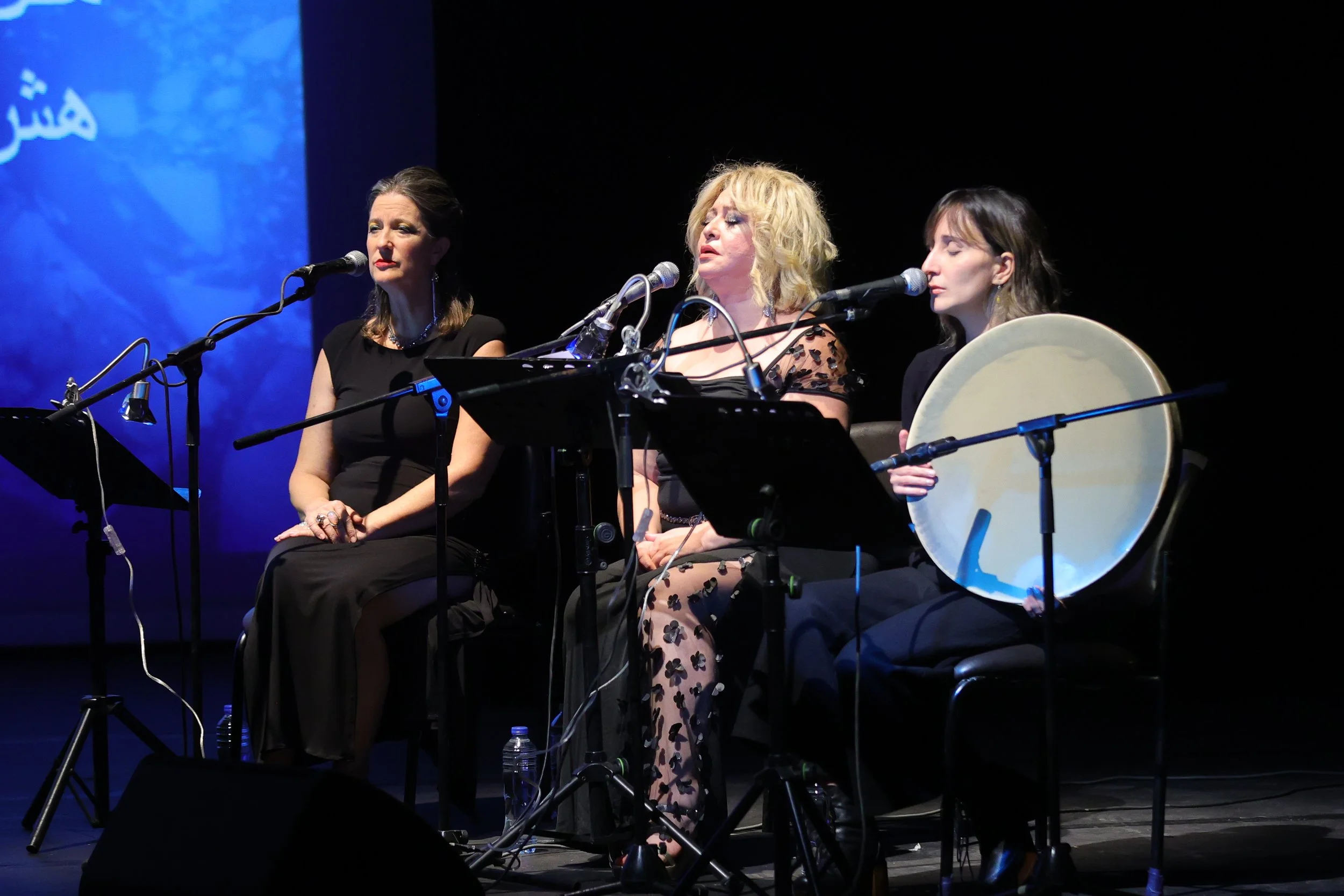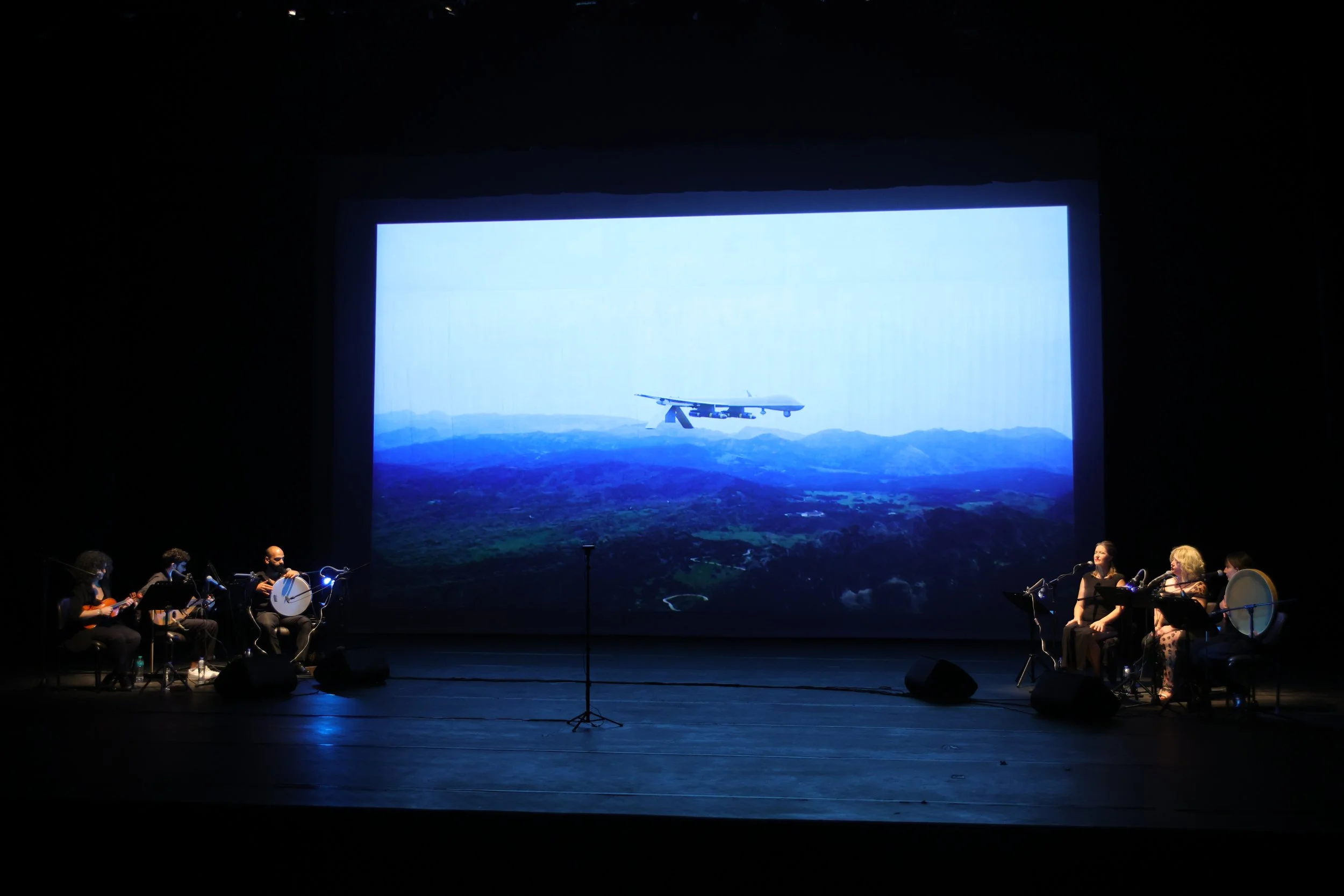 Based on the real-life testimonies of survivors and witnesses of U.S. military drone strikes, written into multi-voice poetry by Andrea Assaf, DRONE: Testimonies & Music is a touring concert of poetry, live music, and video projections. The original music score incorporates droning from diverse music traditions—from the U.S. South, to Southwest and Central Asia—featuring internationally acclaimed vocalists Lubana Al Quntar, Kathy Randels, and Aida Shahghasemi, with music direction by violinist Eylem Basaldi. Three “Survivors” perform the poetic testimonies, underscored and interspersed with music and songs in English, Arabic, and Farsi.